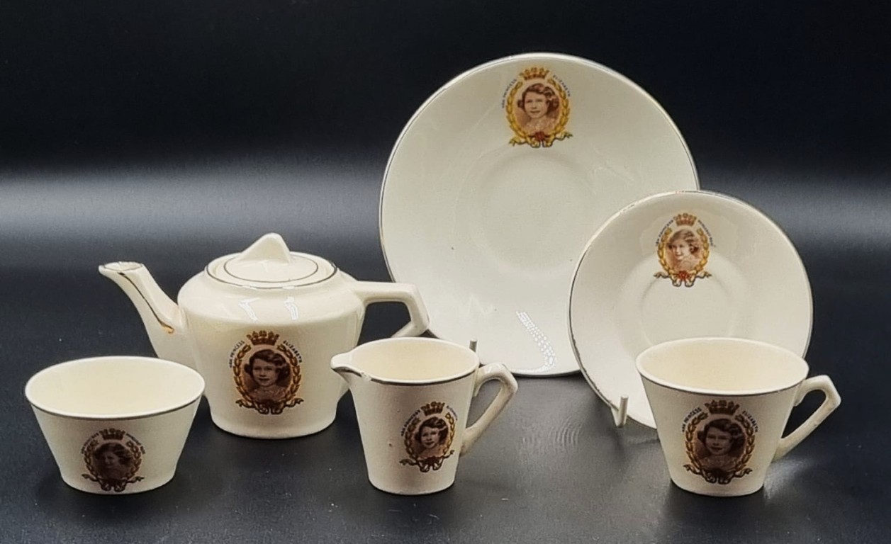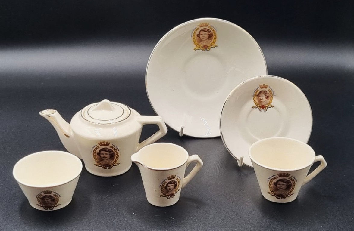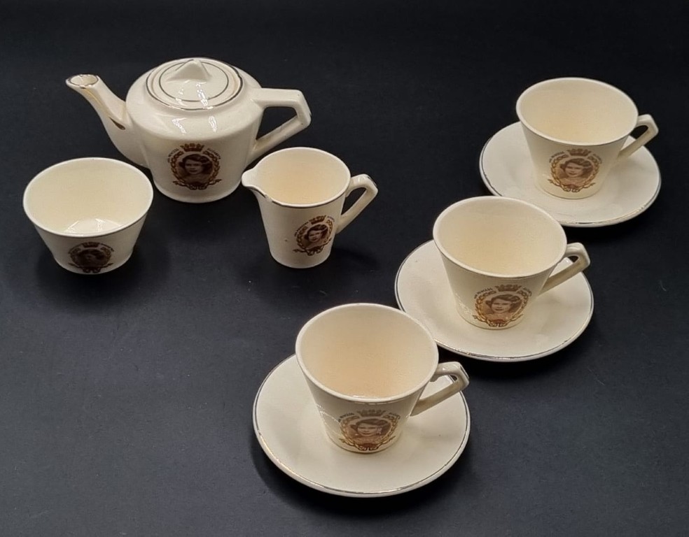 comprising: 1 x teapot with domed finialled cover, 1 x milk jug, 1 x sugar bowl and 3 x teacups and saucers PLUS 2 x graduated saucers, all featuring sepia transfer-printed portraits of H.R.H. Princess Elizabeth and her younger sister H.R.H. Princess Margaret Rose, each enclosed by a floral husk frame and surmounted by a coronet AND 2 x extra graduated saucers (Condition report: Minor chip to rim of milk jug)