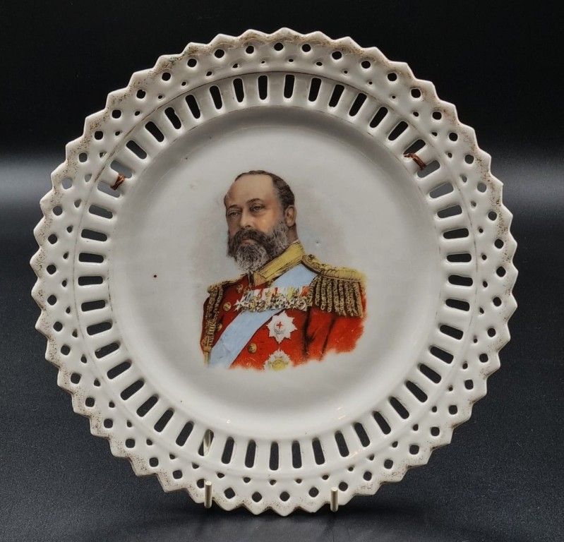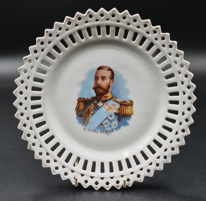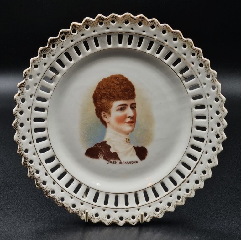 comprising: 1 x H.M. King Edward VII, 1 x Queen Alexandra and 1 x H.M. King George V, each transfer-printed portrait enclosed by a pierced and reticulated latticework border and remnants of gilt overglaze (Diameter: 21cm each) (Condition report: Age wearing, minor imperfections and minute chips to the rim of one plate)
