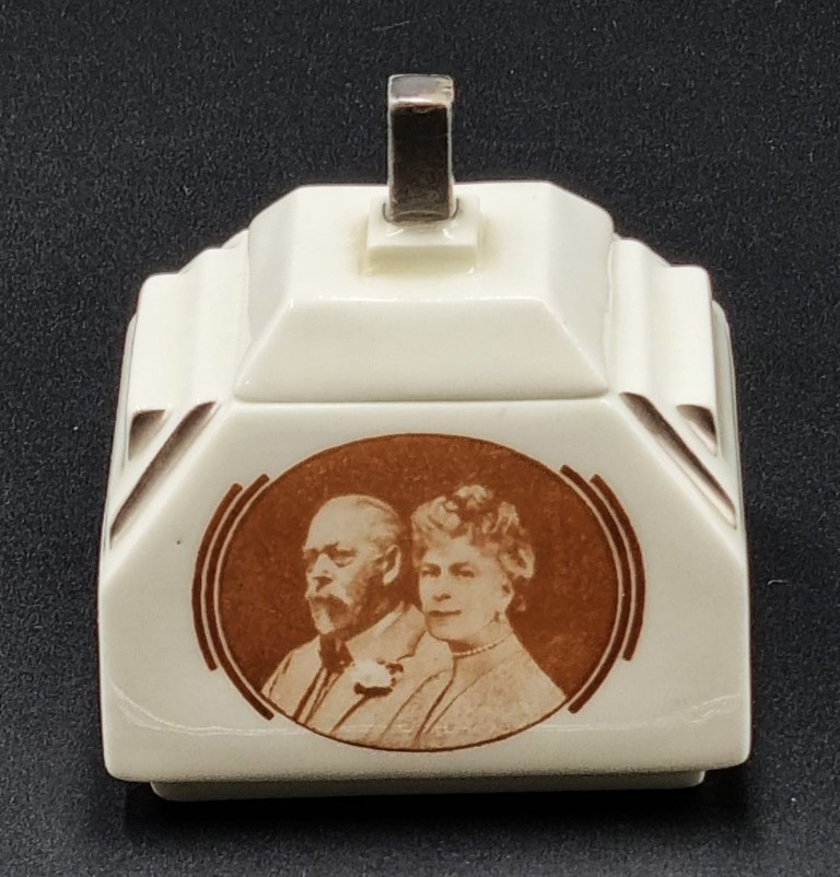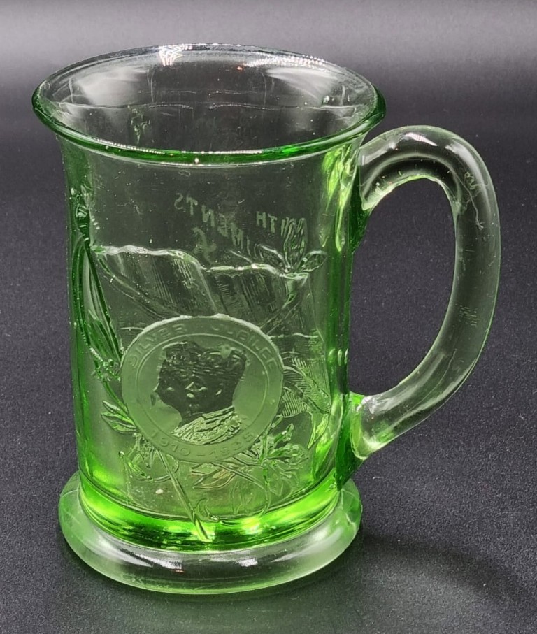 Shape no. 175, the body of modernist trapezoidal form, silver overglazed stepped tab handles, the obverse depicting a sepia portrait of their Majesties King George V and Queen Mary and verso inscribed: G and M flanked by the imperial crown of St Edward and further inscribed: 1910-1935, on a square-shaped base with factory marks on the underside (Minor nick to finial) (7.5 x 7 x 7cm) PLUS a scarce Silver Jubilee Ok Bazaars Matchcase Holder Souvenir, featuring sepia portraits of the King and Queen, verso inscribed: With compliments from O.K. Bazaars (1929), branches throughout South Africa ( 2.5 x 6 x 2cm) AND a green pressed glass beaker with impressed and moulded decoration, inscribed: With Compliments from Mr and Mrs J. Klein, Marquis of Cornwallis, on a circular base (Height: 11.5cm, diameter: 8.5cm)