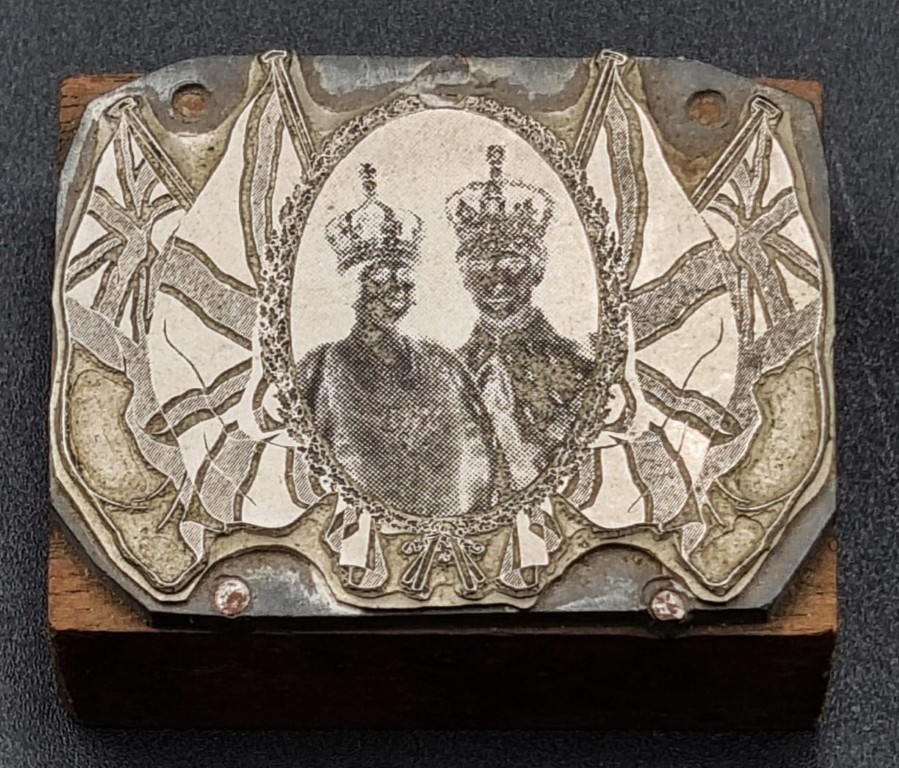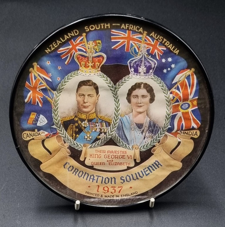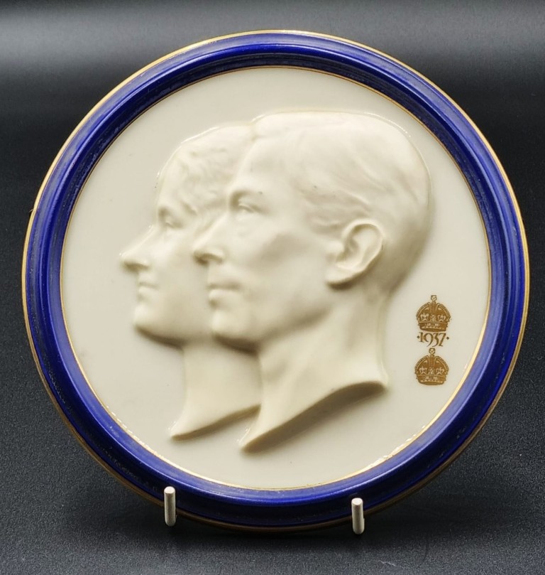 the disc-shaped body featuring relief moulded in profile heads of King George VI and Queen Elizabeth, embellished with 2 x imperial crowns and further dated 1937, enclosed by a cobalt blue and gilt over glazed banded surround, verso with factory backstamp and Shape no. 148 (Diameter: 16cm) PLUS a framed and glazed 1937 Coronation Souvenir lithographic print, depicting 2 x intertwined wreathen portraits of the King and Queen, featuring flags of the Commonwealth and inscribed: Canada, N, Zealand, South – Africa, Australia and India (Frame diameter: 15.2cm) PLUS a souvenir ink block stamper