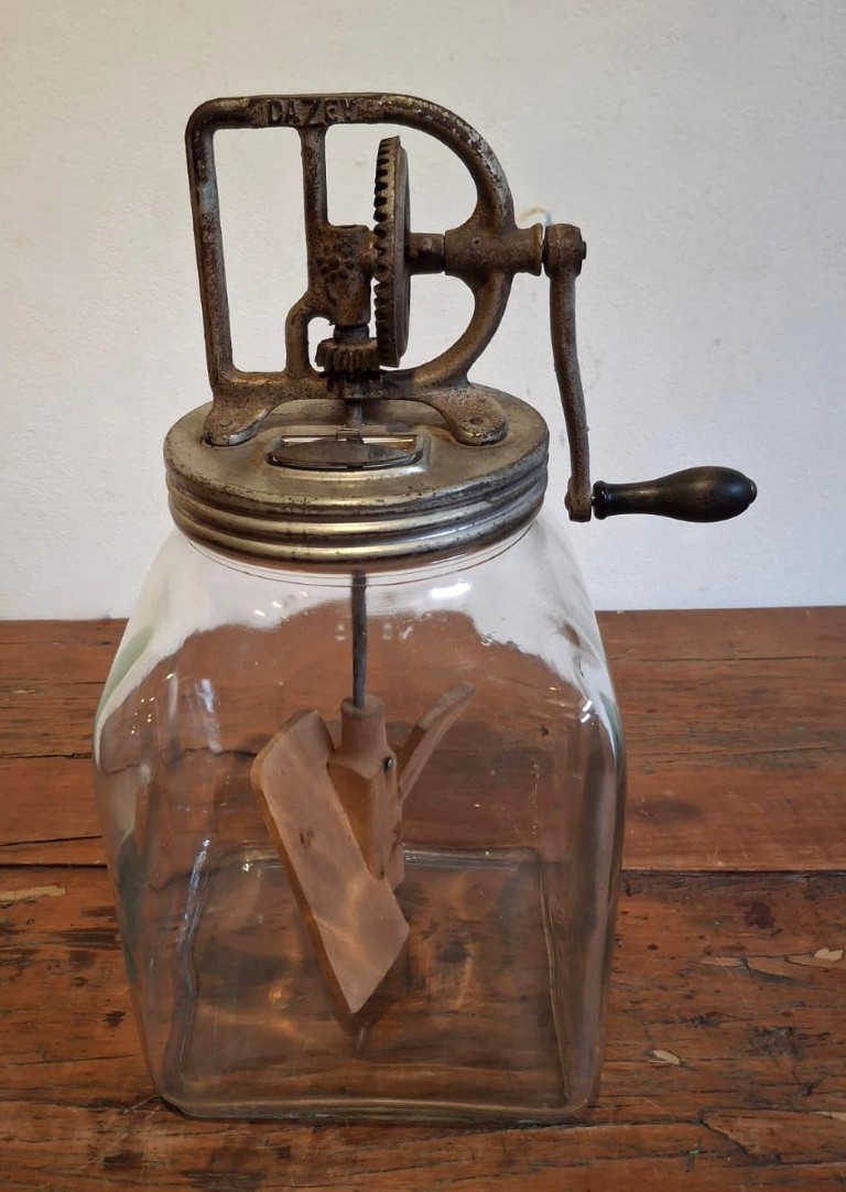 Maker: Dazey Churn and Mfc. Co, St Louis. Mo (Missouri),Patented Feb 14.22, the raised and cast silver painted hand driven gear system, crank handle, ending in a spindle-turned ebonised wooden handle, mounted on a flat domed threaded cover with pierced grille flap cover, over a lower square-shaped thick clear glass jar, enclosing a vertical shaft and terminating in a wooden paddle (dashers) (Height: 40.5cm, diameter: 14cm) (Condition report: Chip to rim, age wearing and oxidation evident)