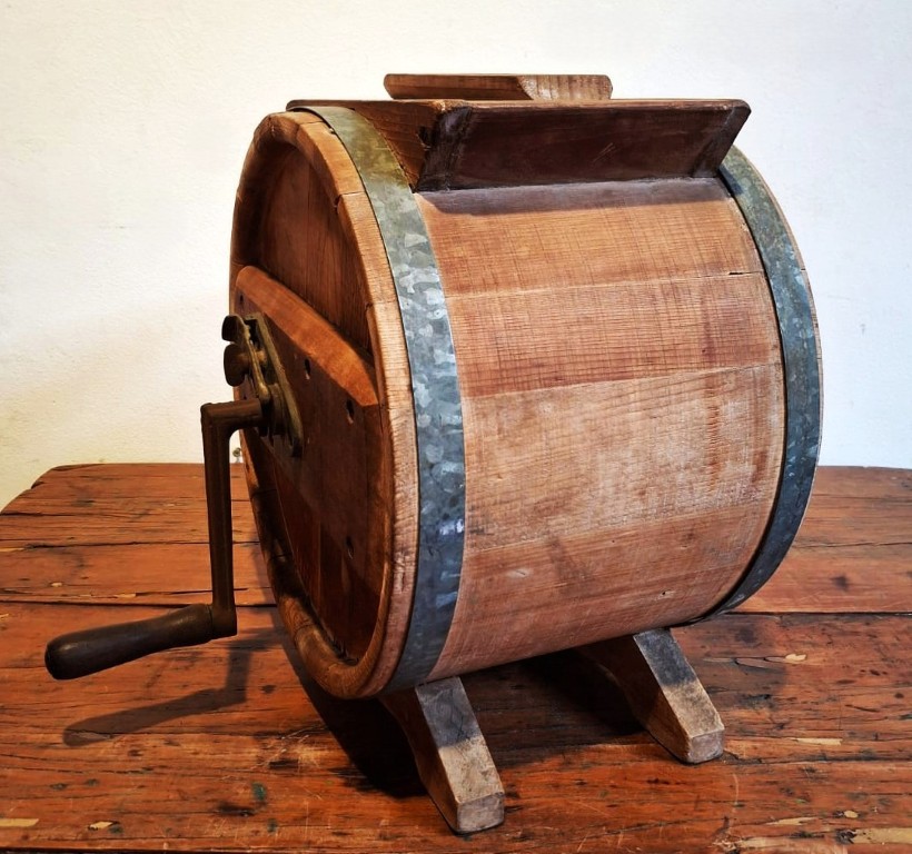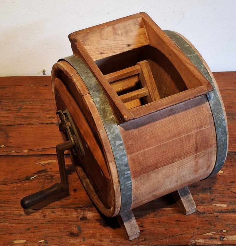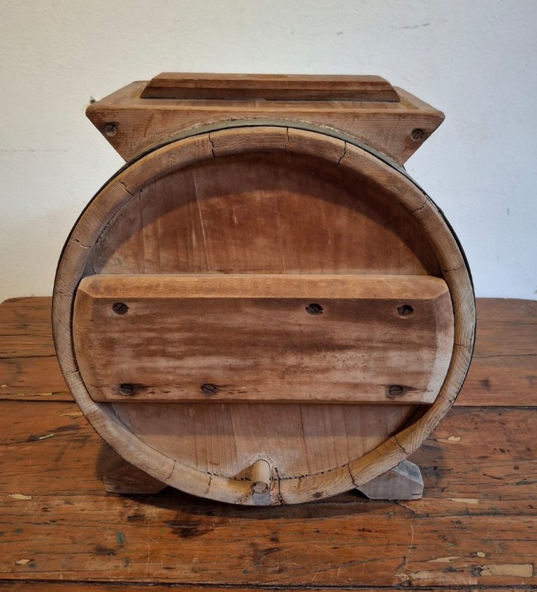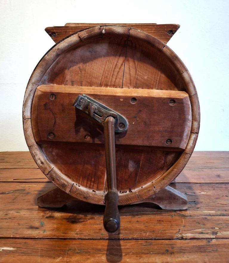 the drum-shaped slat panel body with cast metal strapwork bands, rectangular-shaped opening and detachable cover, fitted with a removable metal crank and turned wooden handle, which operates the internal paddles, supported on shaped and curved bracket supports (37 x 32.5.5 x 24cm) (Condition report: Age wearing and oxidation evident) Literature: Cook, A.M. The Cape Kitchen, p. 104, pl. 118 illustrates a similar butter churn housed in the Stellenbosch Museum’s collection