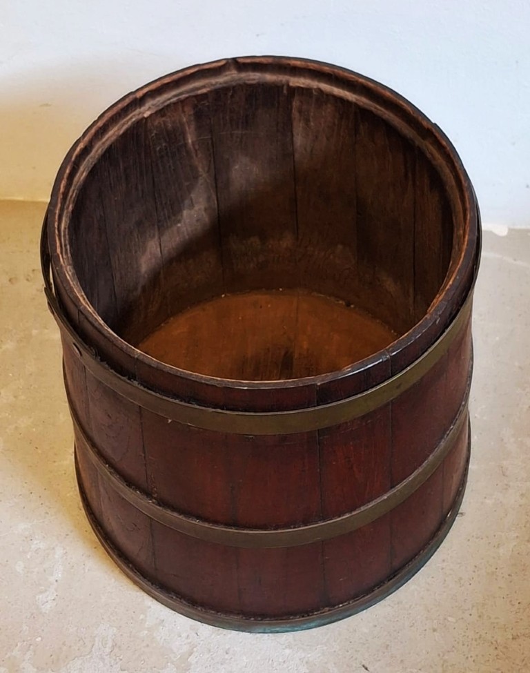 in two sections, the waisted cylindrical slat panel body, adorned with brass strapwork bands, the cover featuring a central pierced opening with plunger, terminating in a cross-piece, on a circular base (Condition report: Age wearing, oxidation, repairs and replacements evident) (Height: 45cm, diameter: 29.5cm) (Plunger length: 91cm)