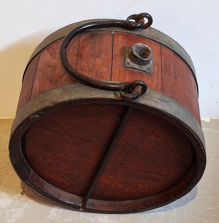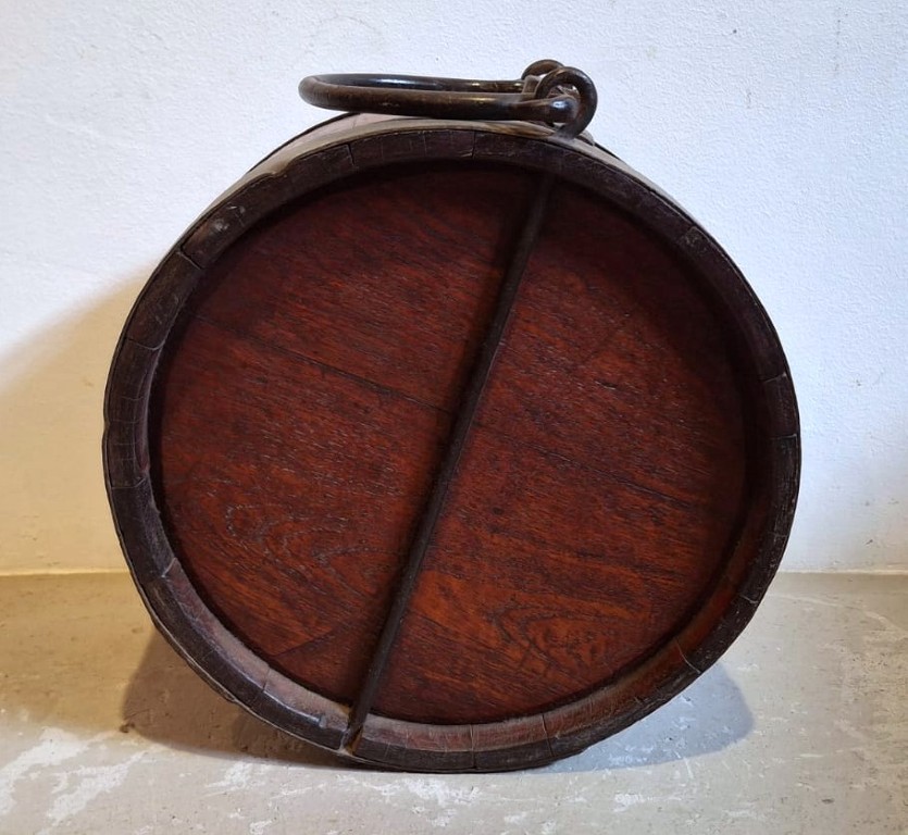 the drum-shaped body, fitted with cast black metal strapwork bands, surmounted by a cast iron lugs and hooped swing-handle (37 x 38 x 21cm) (Height with handle: 49.5cm) (Condition report: Age wearing and oxidation sans Cap) Literature: Baraitser, M and Oberholzer, A. Cape Country Furniture. p.344, pl. 1182 and 1183 display similar wagon water casks.