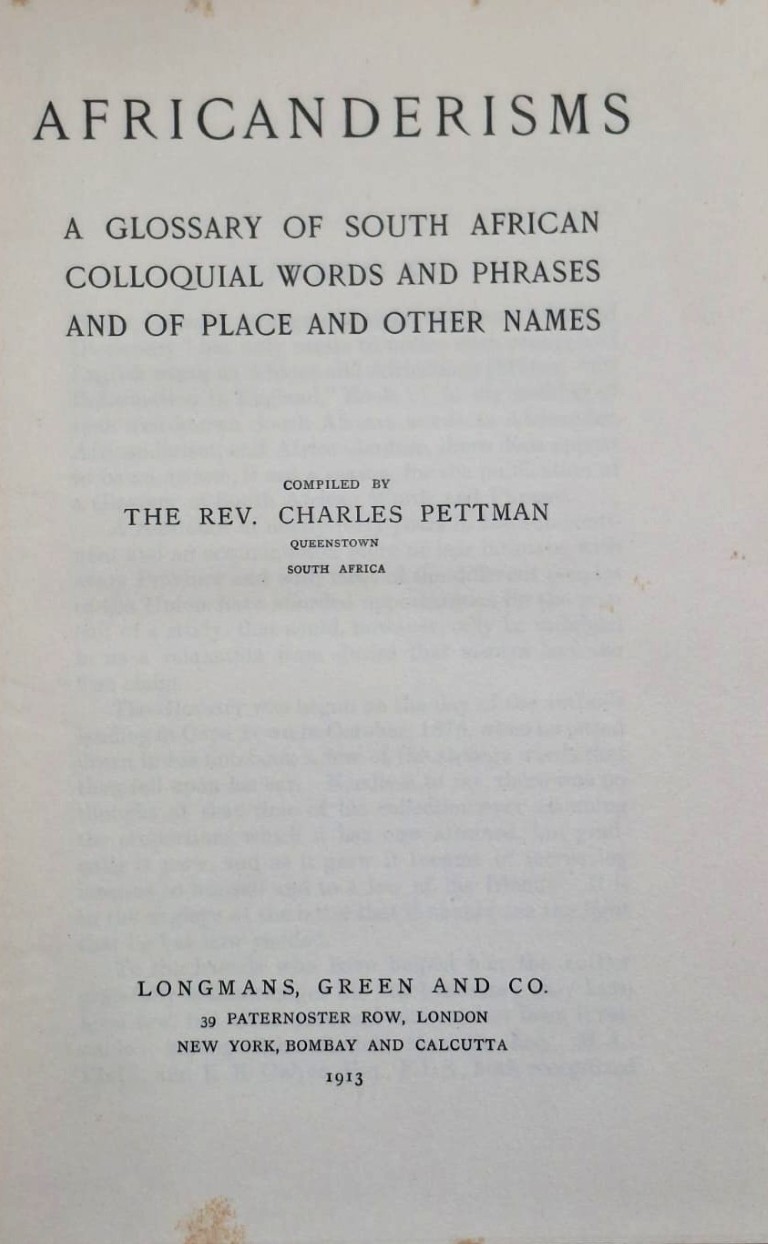 LOT 312 (32531) Est R200 to R400 – PETTMEN C. – Africanderisms; A Glossary of South African Colloquial Words and Phrases and of Place and Other Names