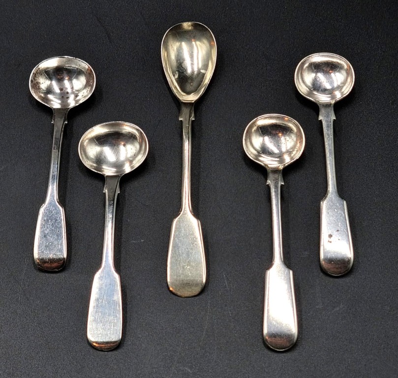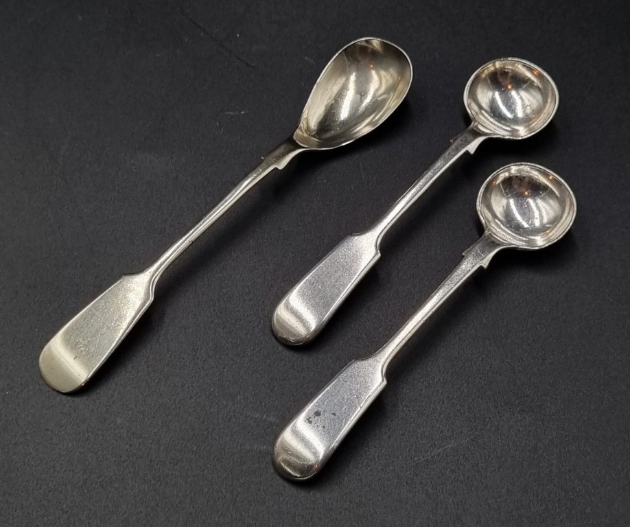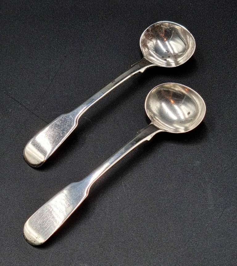 Makers: John Hawkins, London 1821 and James Beebe 1830, each featuring an egg-shaped bowl and a plain terminal (Length:10.5cm each) PLUS a Late Victorian Britannia Plate mustard spoon, Maker: Cooper Brothers and Sons, Sheffield established 1866 AND a pair of Late Victorian EPNS Fiddle pattern salt spoons, Maker: C & Co, F & Co (Length: 13.5cm) (Weighable silver mass: 23g)
