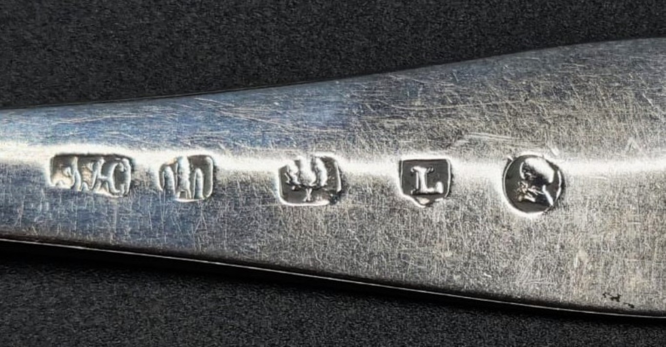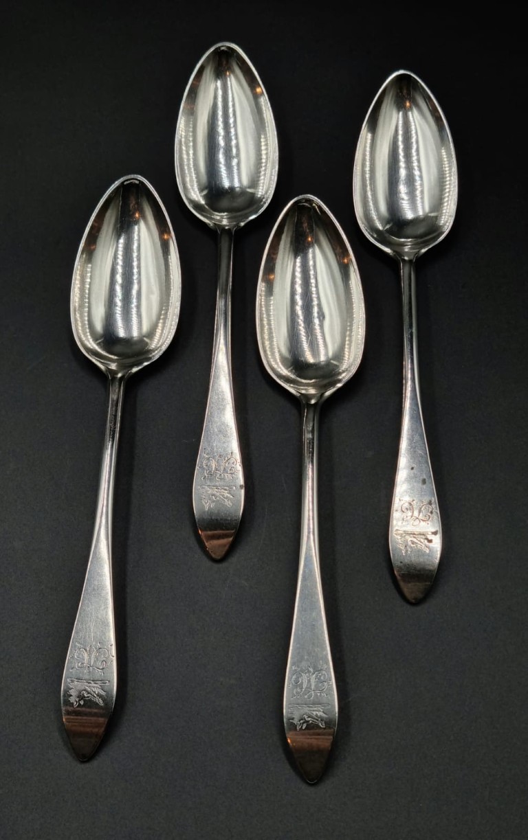 Maker: James Hewitt, Edinburgh 1789-1791, each egg-shaped bowl, attached to a plain and graduated terminal, depicting an engraved and bright-cut boar’s head erased armorial crest of the armigerous clan Baillie, over an engraved cursive initial N (Mass: 262g) (Length: 23cm each) (Condition report: Minor pitting evident due to age and oxidation) Literature: Fairbairn’s Book of Crests of The Families of Great Britan and Ireland, p.28, Bag – Bai, third row, 10th entry, pl. 43.2 illustrates the crest