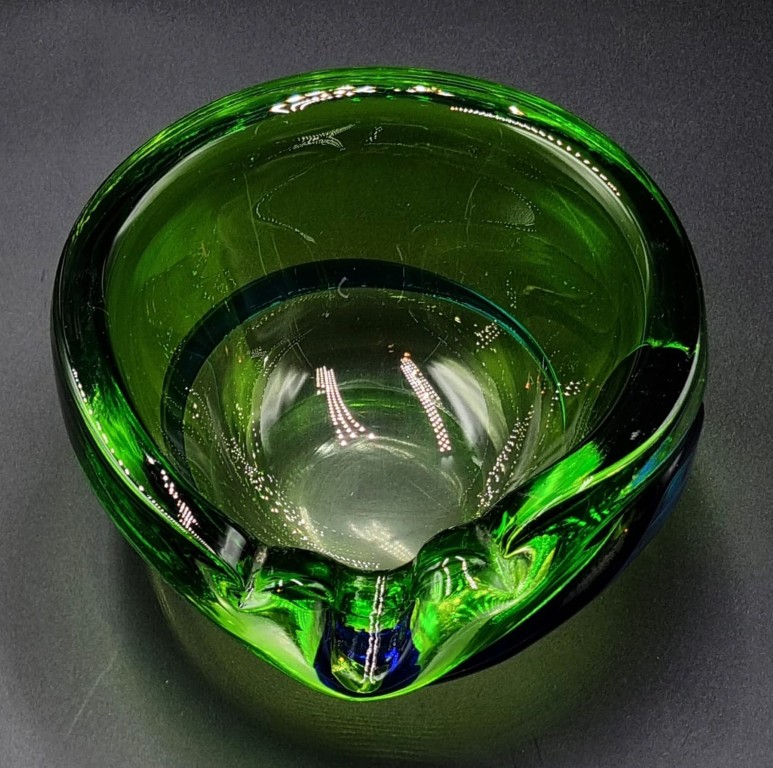 the shaped and pulled emerald green body with applied graduated cobalt trailed motif, on a polished base (9 x 17.5 x 18.5cm)