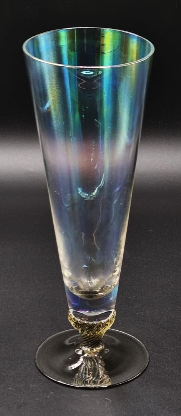 each waisted iridescent lustre body, on a smoky glass swirl fluted spiral knop and circular rising base (Height: 22.5cm, diameter: 8cm each) (Condition report: 2 x with minor chips to base)