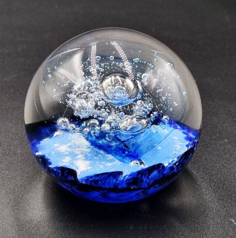 the globular shaped clear glass body, encased in shades of cobalt, lilac and milk glass and embellished with swirling bubble inclusions, on a polished circular base, signed and laser etched: Selkirk Glass Scotland and dated 1995 on the underside (Height: 7cm) (With original silver foil label)
