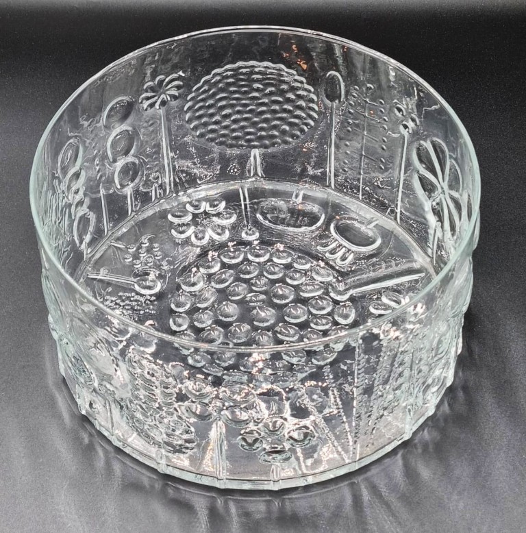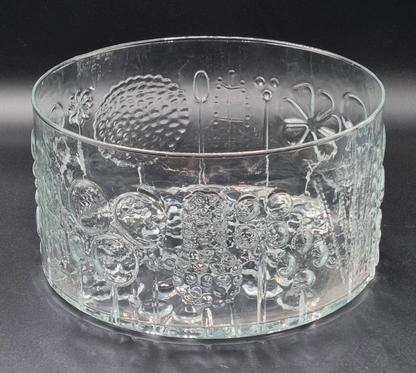 first designed by Oiva Toikka in 1966, the basin-shaped clear glass body with embossed tree, flower and plant motifs, on a circular rising base (Height: 13cm, diameter: 24cm)