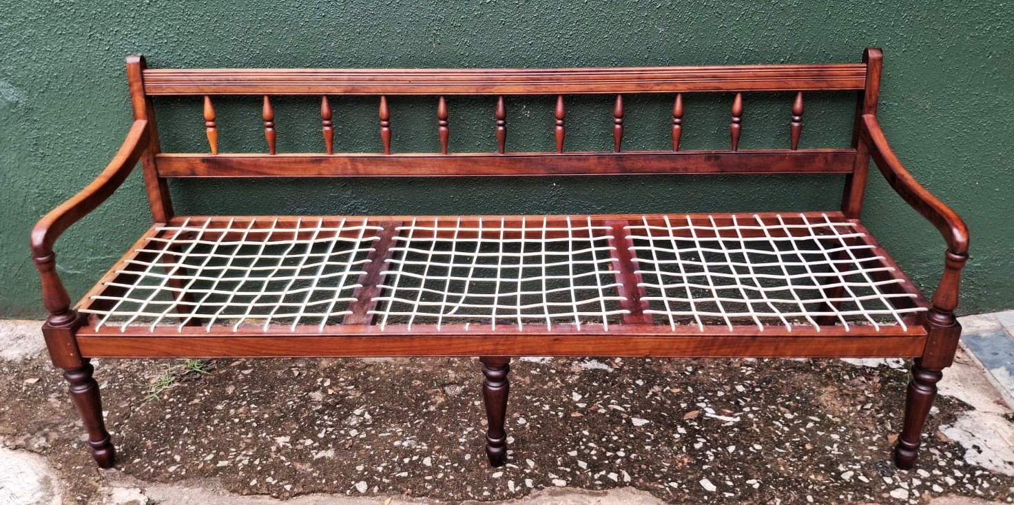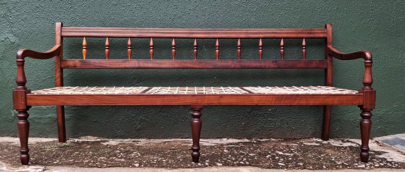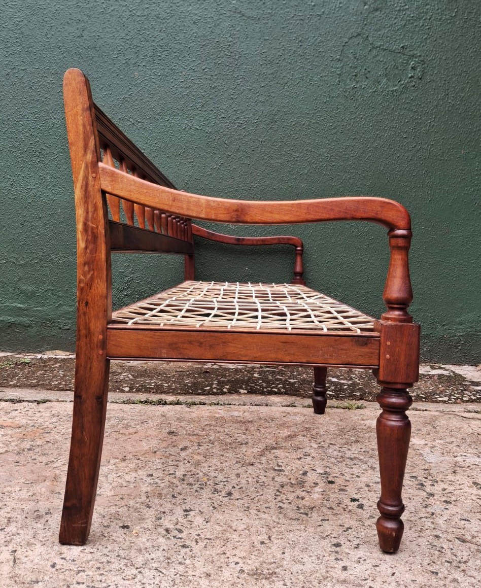 the horizontal carved and incised grooved top-rail, united betwen shaped outcurved post supports, above a spindle-turned gallery and lower bottom rail, flanked by integral downcurved arms, on pear-shaped stiles, 3 x sectional riempie strung seats, over a conforming apron on block-turned, ring-turned baluster and tapered legs, on turned feet (Total length: 186.5cm)