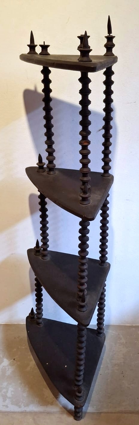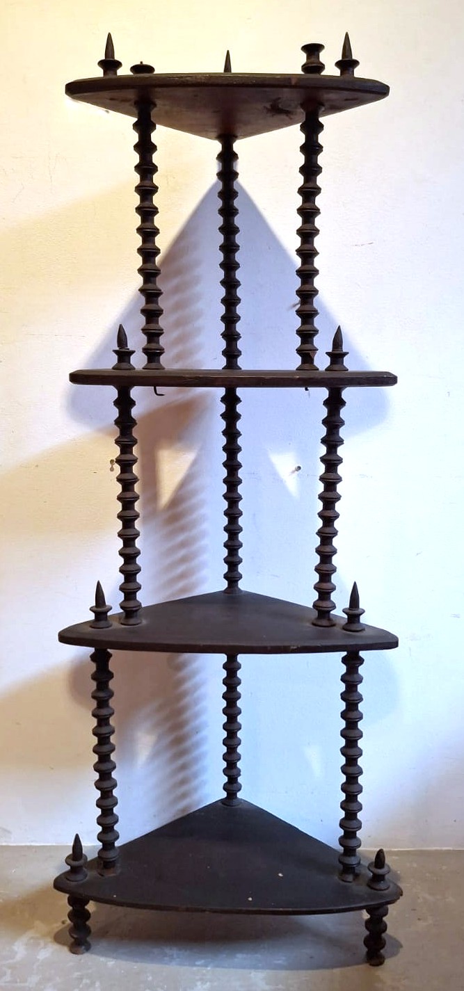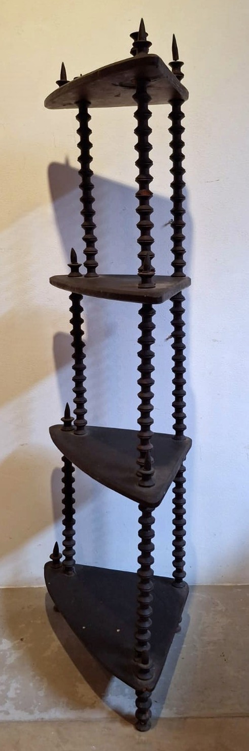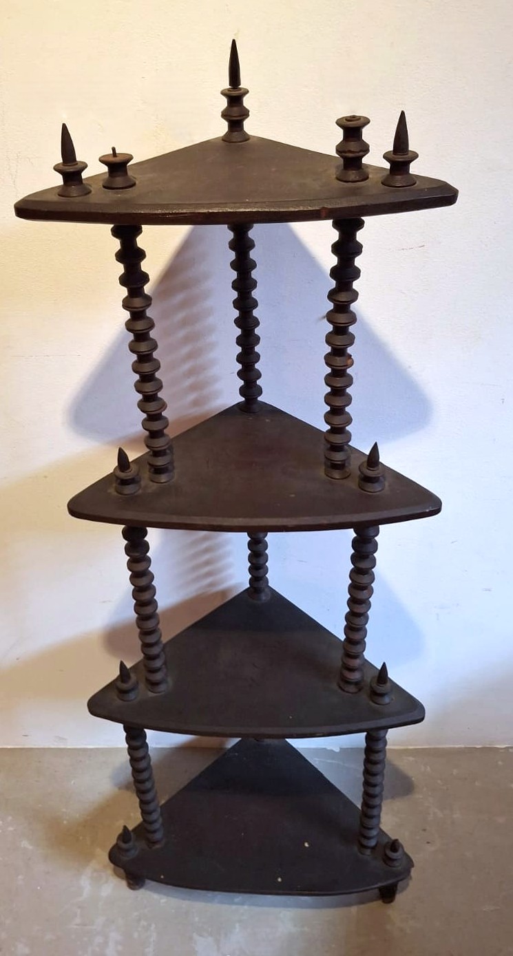 the triangular-shaped teabox open tier, surmounted by cotton reel finials, over stacked cotton reel supports and 3 x lower conforming tiers, on turned feet (146 x 47 x 27cm) (Condition report: Distressed and losses evident) Note: This whatnot was made during the Great Depression period (1929-1934) when there was a shortage of materials and supplies were scarce.