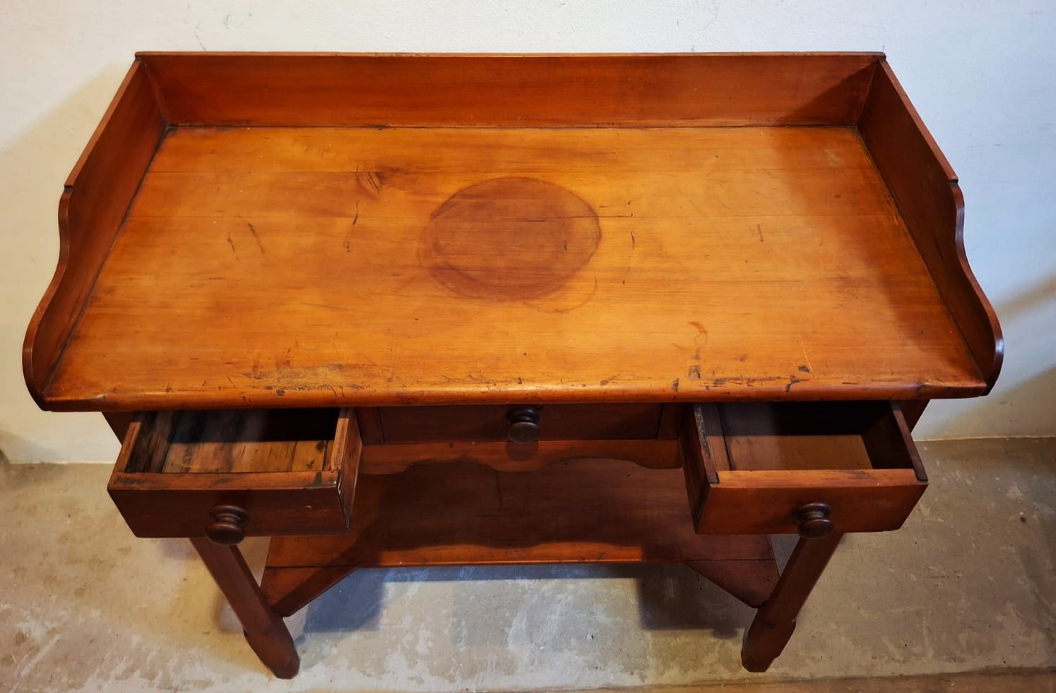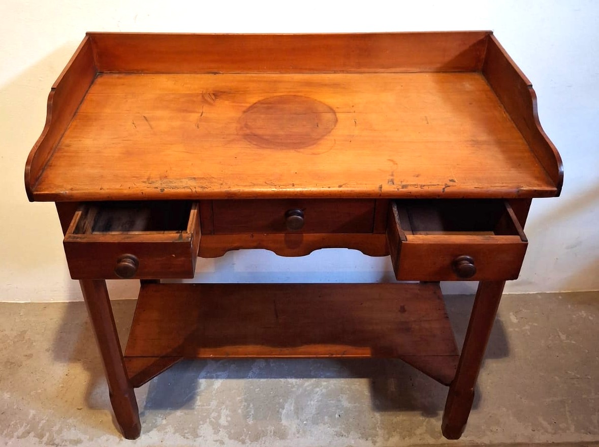 the 3/4 top gallery rail, set on a lower rectangular-shaped top, above a 3-drawer frieze with central short dummy drawer, over a serpentine apron and lower tier, on notched and chamfered square tapered legs, united by side struts (93.5 x 92.5 x 46.5cm)