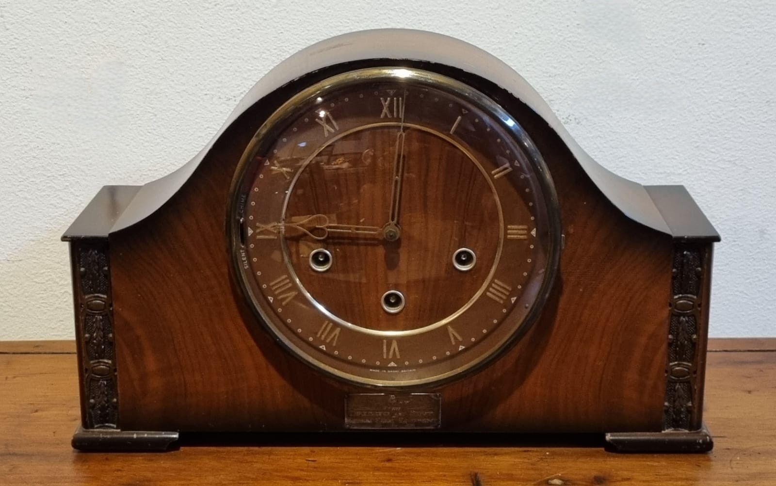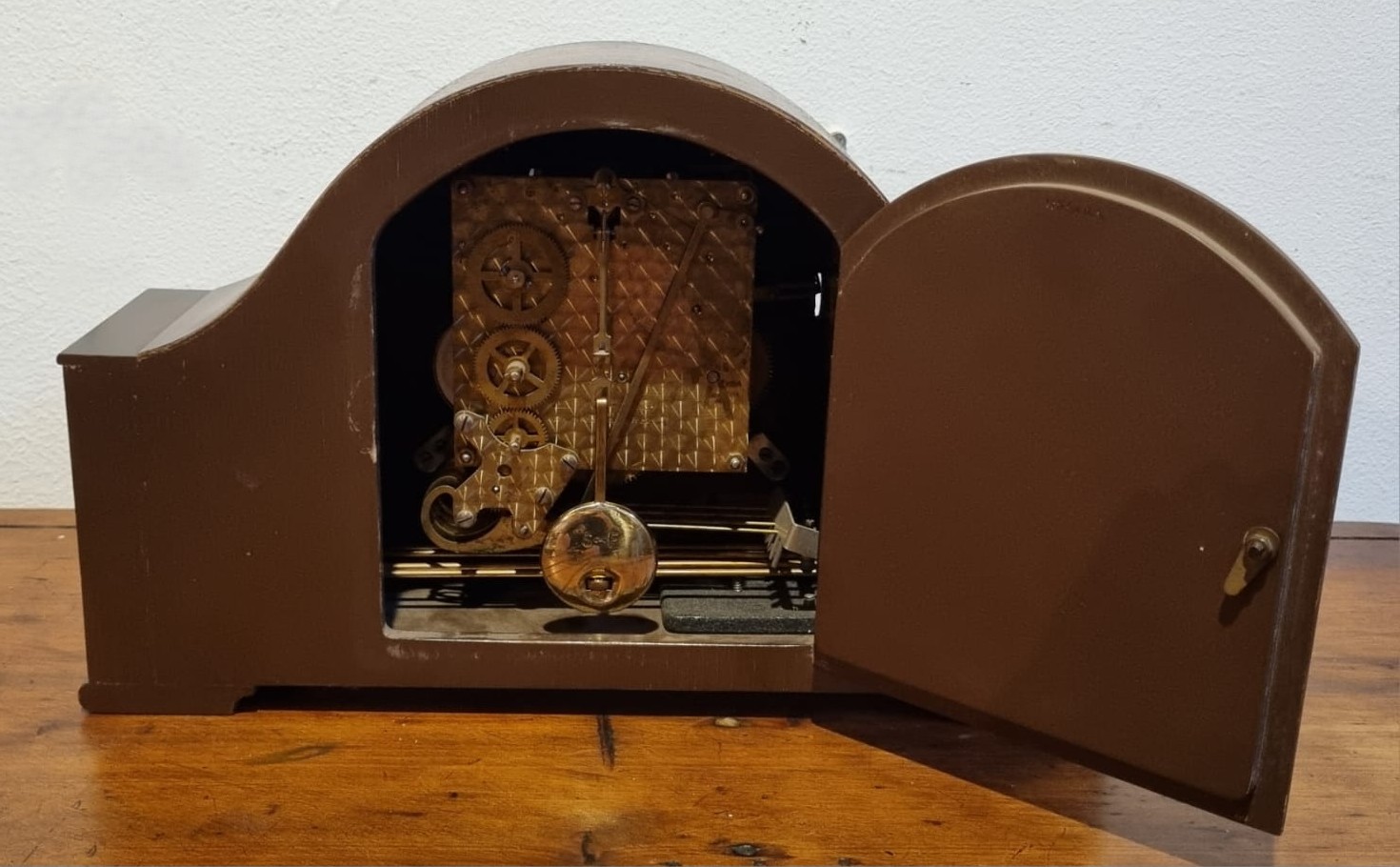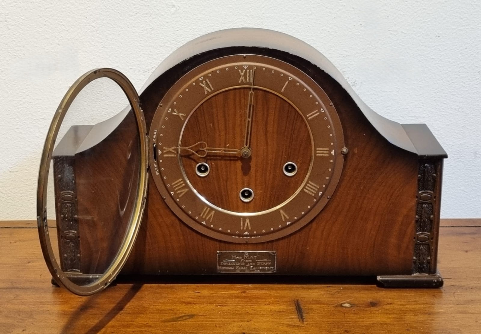 Movement no. stamped: K6A 584, the gabled and stepped tambour case with central gilt metal and convex glazed panel door, enclosing an embossed Roman numeral chapter ring and three winding key holes, fitted with a chime/silent mechanism, skeleton syringe and club hands, chimes on the quarters and strikes on the hour, flanked by raised and moulded Art Deco-style floral husk and cabochon panels, further embellished with a silvered metal presentation plaque engraved and inscribed: To Mrs May from the Directors and Staff Modern Farm Equipment and dated; 31.12.59, on a shaped bracket feet (Condition report: In working order) ( 23 x 36 x 11cm) (With winding key and pendulum)