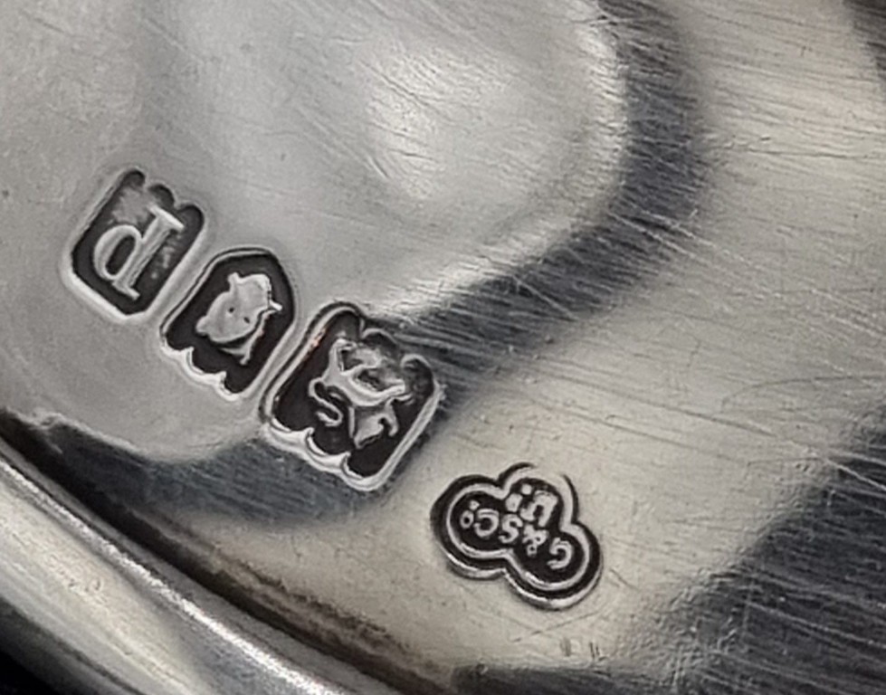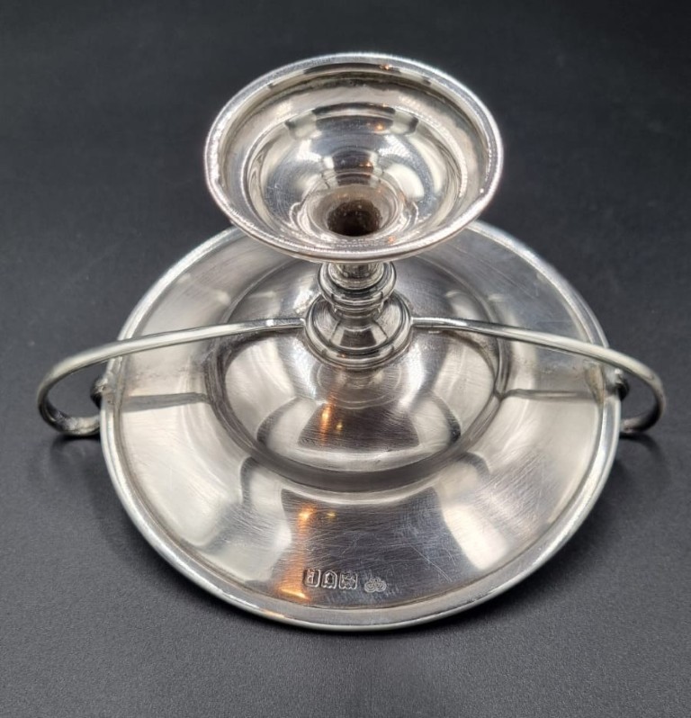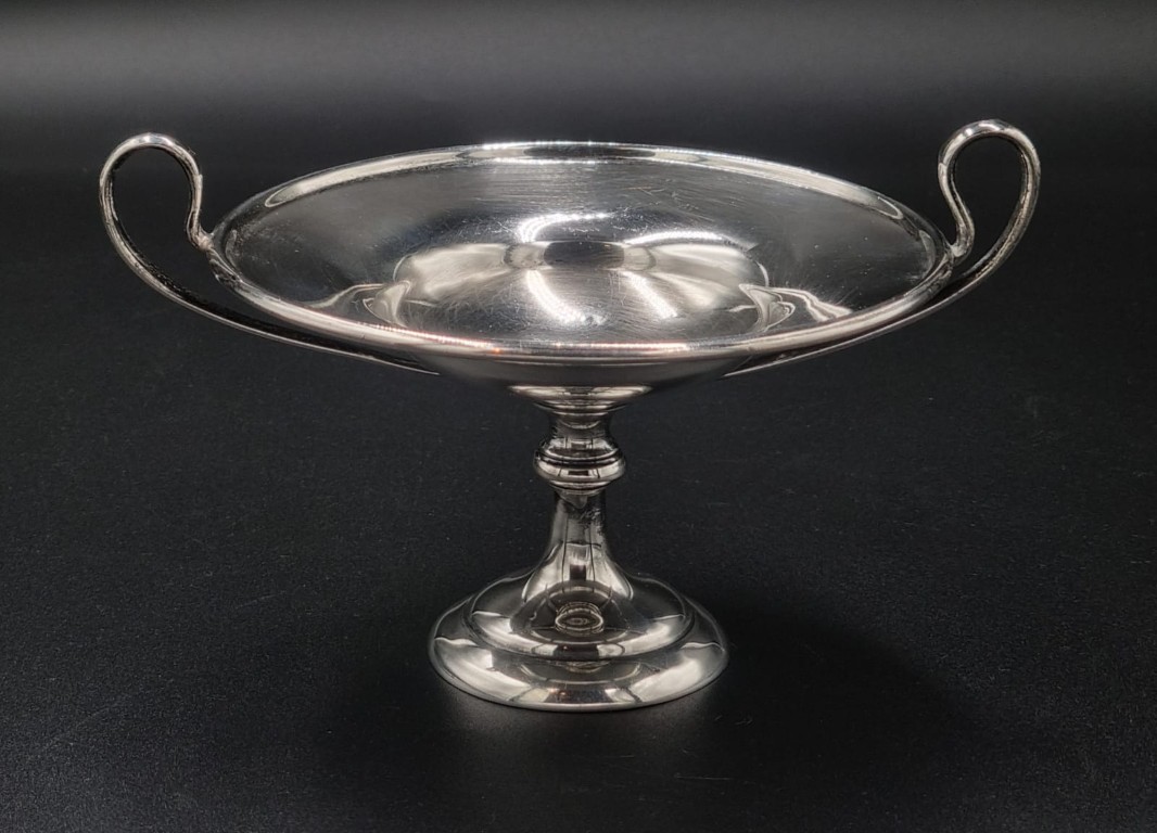 Maker: Goldsmiths and Silversmiths Co Ltd, London 1910, the shallow dished and elliptical shaped campana body with plain raised rim, flanked by integral slender strapwork handles, over a knopped stem, on a stepped circular rising base, further stamped with retailer’s Goldsmith and Company, 112 Regent Street, W. on the underside (Mass: 113g) (Height: 9cm, diameter across handles: 14.5cm)