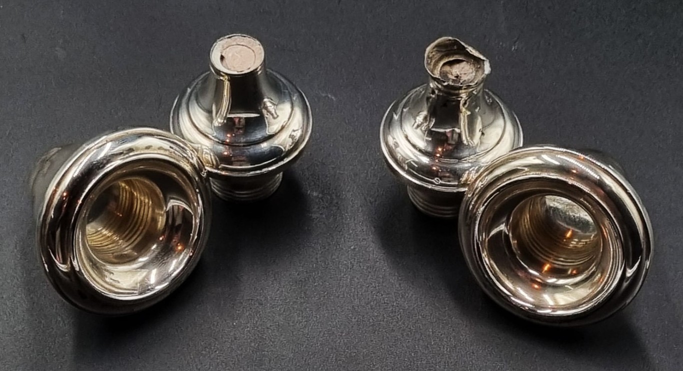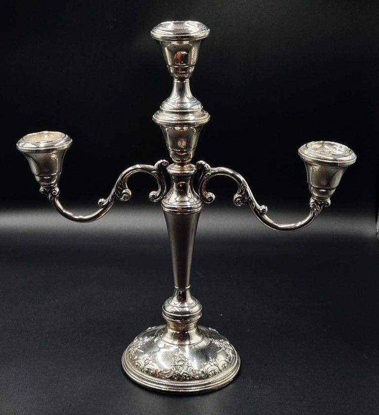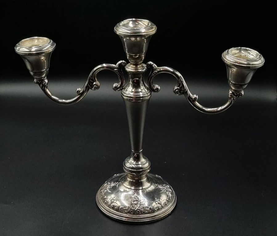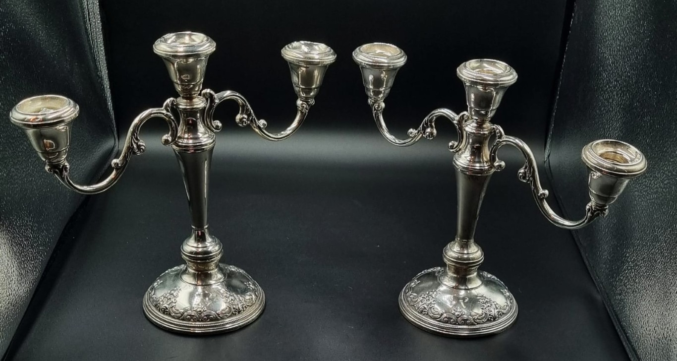 Maker: Wallace Sterling (R Wallace and Sons), Wallingford, Connecticut founded in 1835 – , pattern first introduced in 1941, stamped model no.4101, each central plain vase-shaped capital with attached sconce, flanked by integral cast scrolling leaf arms, surmounted by two conforming candle nozzles, suppported on a plain tapered stem and lower reeded knop support, on a circular rising stepped base, embellished with raised and embossed rose, rocaille and leaf motifs, enclosed by ribbed and beaded borders PLUS 2 x extension nozzles (Total height: 27cm, total; height with extension: 35cm) (Total mass: 1960g) (Bases and body loaded) (Condition report: 2 x extension nozzles, 1 x candelabra is damaged and detached from its base, minor dents and imperfections evident)