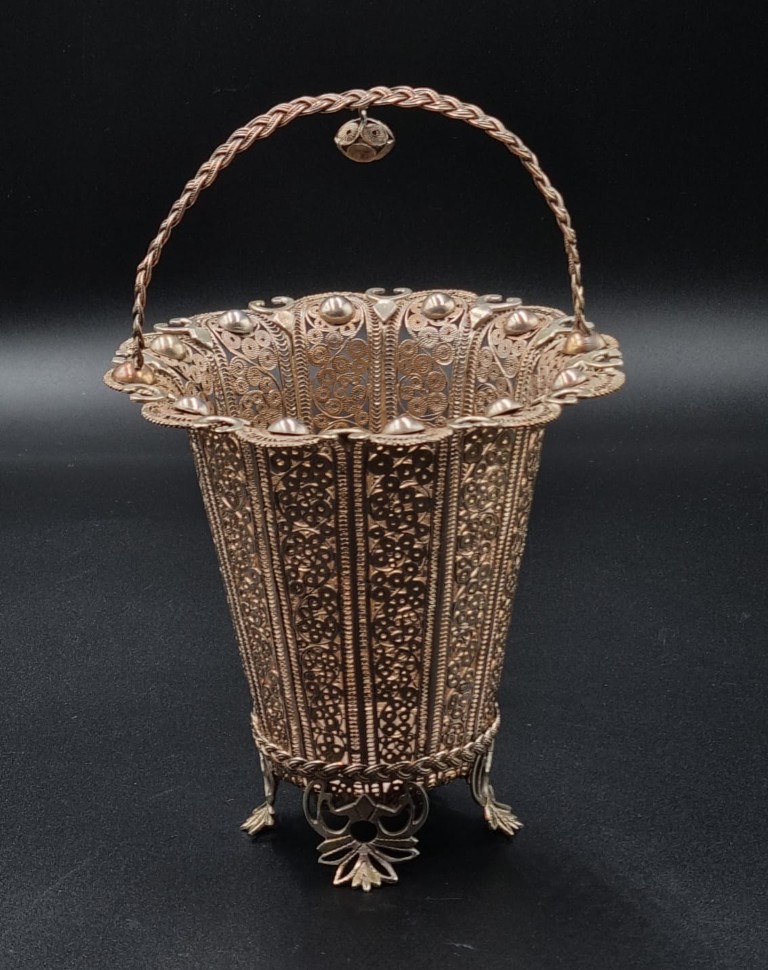 the waisted body with rising and flared floriform rim, ornamented with applied beaded cabochon motifs, surmounted by an applied intertwined basket-weave strapwork hoop handle with suspended filigree bell, over intricate sectional filigree wirework stylised foliate and floral banded panels, enclosed by a conforming woven band on a circular base, raised on applied pierced openwork flowerhead and leaf embellished bracket feet SOLD TOGETHER with 6 x matching teaspoons and 6 x matching 2-prong pastry forks. each plain handle with beaded borders, topped by a leaf-shaped filigree finials, adorned with granulation, blossom and vesica motifs (Total mass: 481g) (Sugar basket height: 20.5cm, diameter: 13.5cm) (Teaspoon length: 15.5cm each) (Pastry forks length: 15.5cm each)
