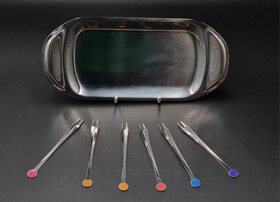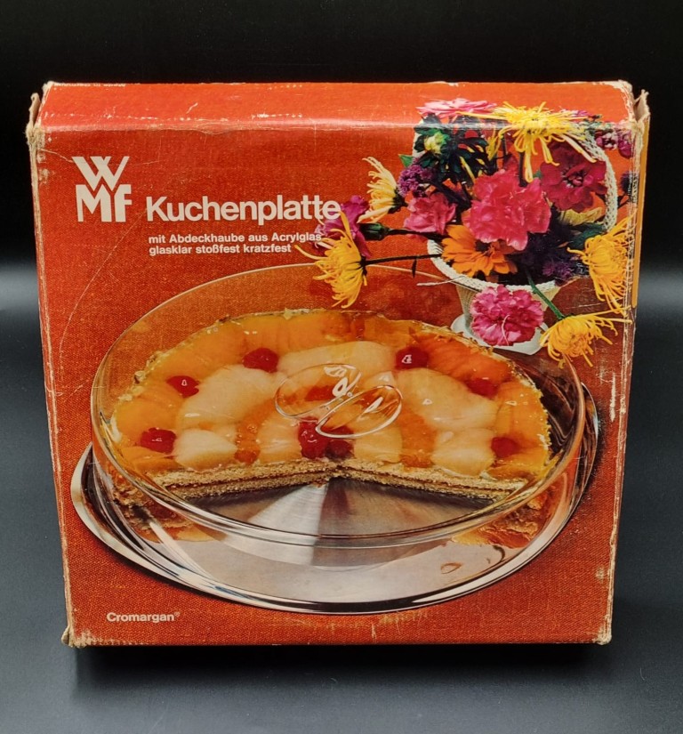 Maker: Württembergische Metalwarenfabrik, Geislingen an der Steige, the clear perspex cover with moulded recessed handle, over a circular -shaped platter PLUS a WMF Cromargan Edelstahl Rostfrei 18/10 Cheese Set, comprising: 1 x lozenge-shaped platter and 12 x matching two prong cheese forks, with multicoloured terminals (Platter diameter: 25cm) (Cheese fork length: 11.5cm each) AND a WMF Cromargan Collection Alt Paris Myristica (Muscat) Whipped Cream Ladle