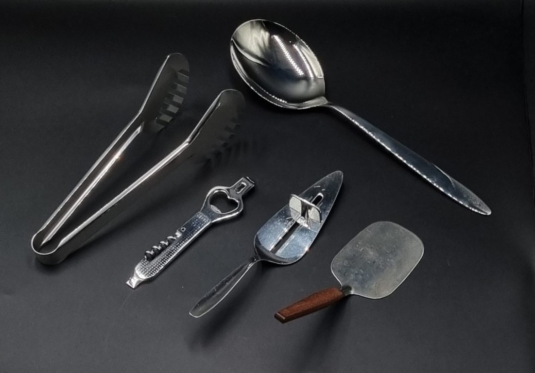 Maker: Württembergische Metalwarenfabrik, Geislingen an der Steige, comprising: 1 x WMF Cromargan serving spoon and pair of matching serving tongs, 1 x tartlet spade, a WMF Cromargan stainless steel 18/10 sauceboat, a small handled nut bowl, a stainless steel corkscrew and bottle opener, featuring engine turned decoration on the handle, a Danish Stainless Steel and teak hafted tart lifter (Largest length: 30.5cm) AND an EP on Brass and clear perspex WMF S-collection napkin box with flat domed and hinged cover, designed by Sigrid Kupetz, Model no. 7468 (348), embellished with modernist geometric motifs, on a matching underplate (6.5 x 18.7 x 13.5cm) (Condition report: Age wearing and oxidation evident)