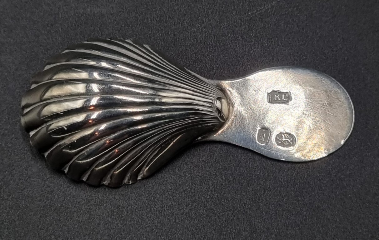 Maker: Richard Crossley, London 1784, the concave stop-fluted scalloped bowl, attached to a short terminal, featuring finely engraved and incised wriggle work and feather edge bands enclosing a conforming vacant foliate shield cartouche (Mass: 8g) (Length: 7.5cm)