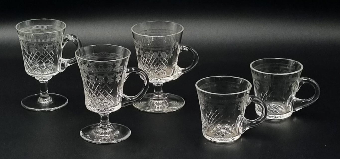 each bowl featuring etched and stylised floral and concentric ring banding, over a cut diamond panel, over a plain stem and circular rising base PLUS 2 x later Hungarian glass custard cups (Tallest: 10.5cm, diameter: 9cm each)